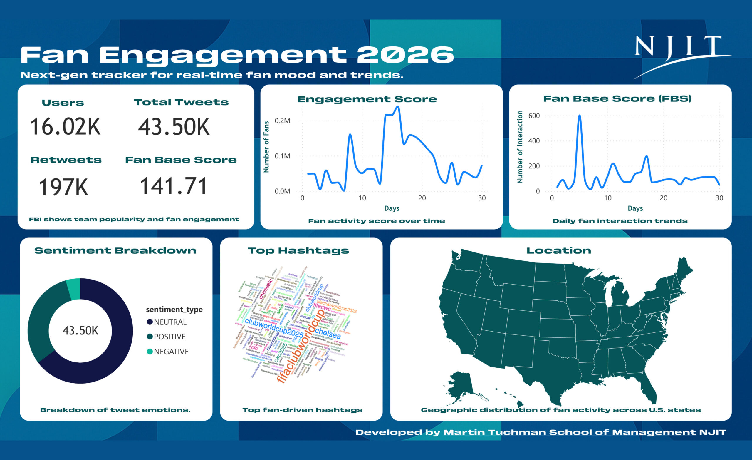 - Dashboard aggregates data from social media and other online sources to capture fan sentiment as well as trends on a national scale, with particular focus on this region