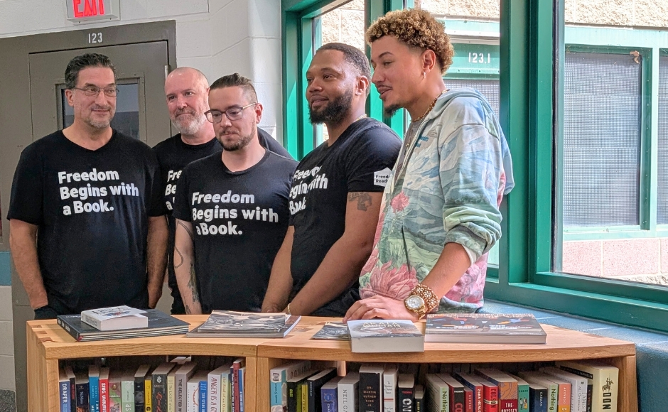 From left: James Flynn, Kevin Baker, Tyler Sperrazza, Mike Byrd, and David Perez DeHoyos from the Freedom Reads project at the Camden County Juvenile Justice Facility. Credit: Matt Skoufalos.