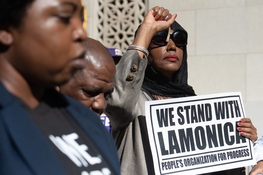 Protestors rally in support of Rep. LaMonica McIver outside a federal courthouse in Newark on Tuesday, Oct. 21, 2025. (Reena Rose Sibayan for New Jersey Monitor)