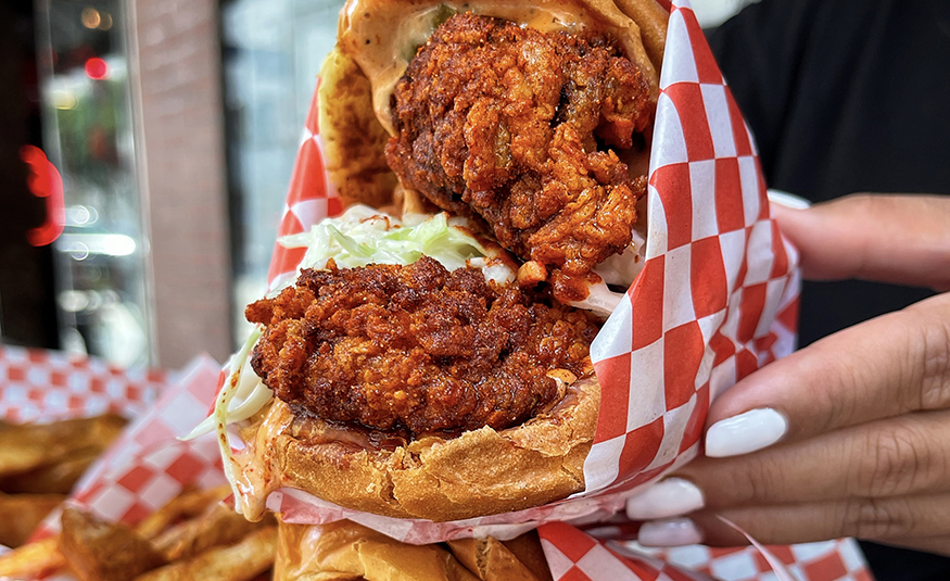 The Red Chickz menu features Nashville hot chicken sandwiches in seven spice levels and unconventional items, like French toast sandwiches and chicken tacos. Additionally, it serves sides such as cauliflower bites, waffles, corn ribs and potato wedges.