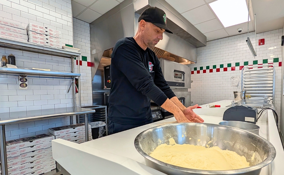Sal Cusomano prepares a pizza at Angelo’s Pizza in West Berlin. Credit: Matt Skoufalos.