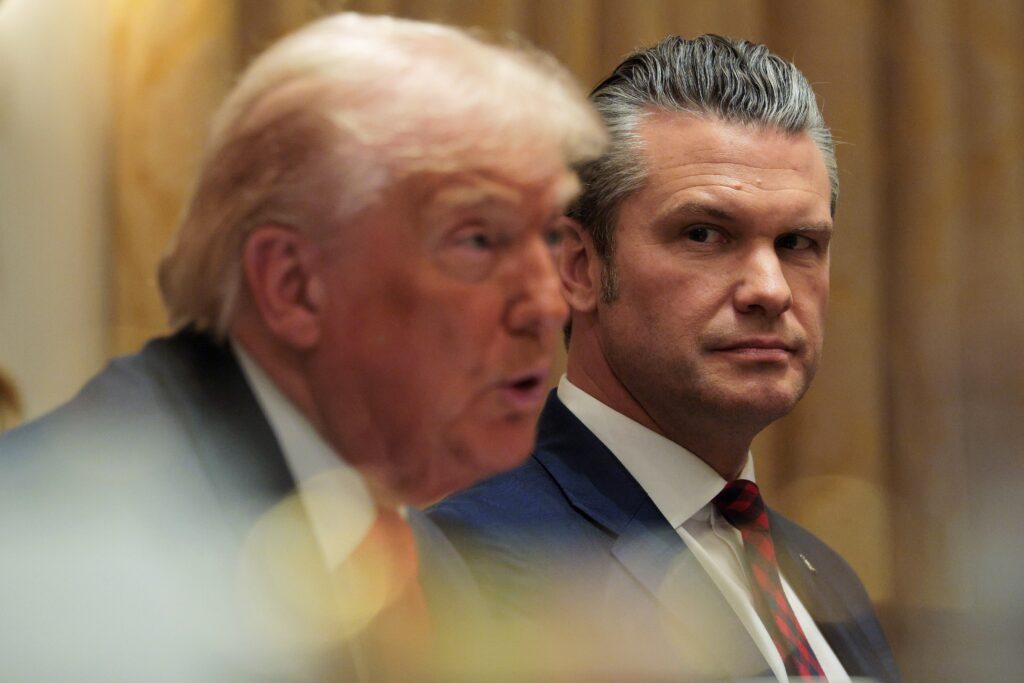 U.S. Secretary of Defense Pete Hegseth, right, looks on as U.S. President Donald Trump speaks during a meeting of his Cabinet in the Cabinet Room of the White House on Dec. 2, 2025 in Washington, D.C. (Photo by Chip Somodevilla/Getty Images)