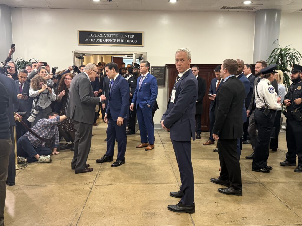 Senate Minority Leader Chuck Schumer, D-N.Y., speaks with Secretary of State Marco Rubio as Defense Secretary Pete Hegseth stands to the side in the U.S. Senate basement following a classified briefing on President Donald Trump’s foreign policy plans on Wednesday, Jan. 7, 2026. (Photo by Jennifer Shutt/States Newsroom)