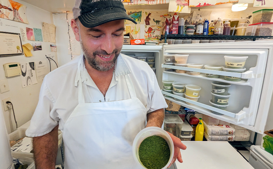 Chef Phil Manganaro shows off foraged water pepper dust in the kitchen at Park Place. Credit: Matt Skoufalos.